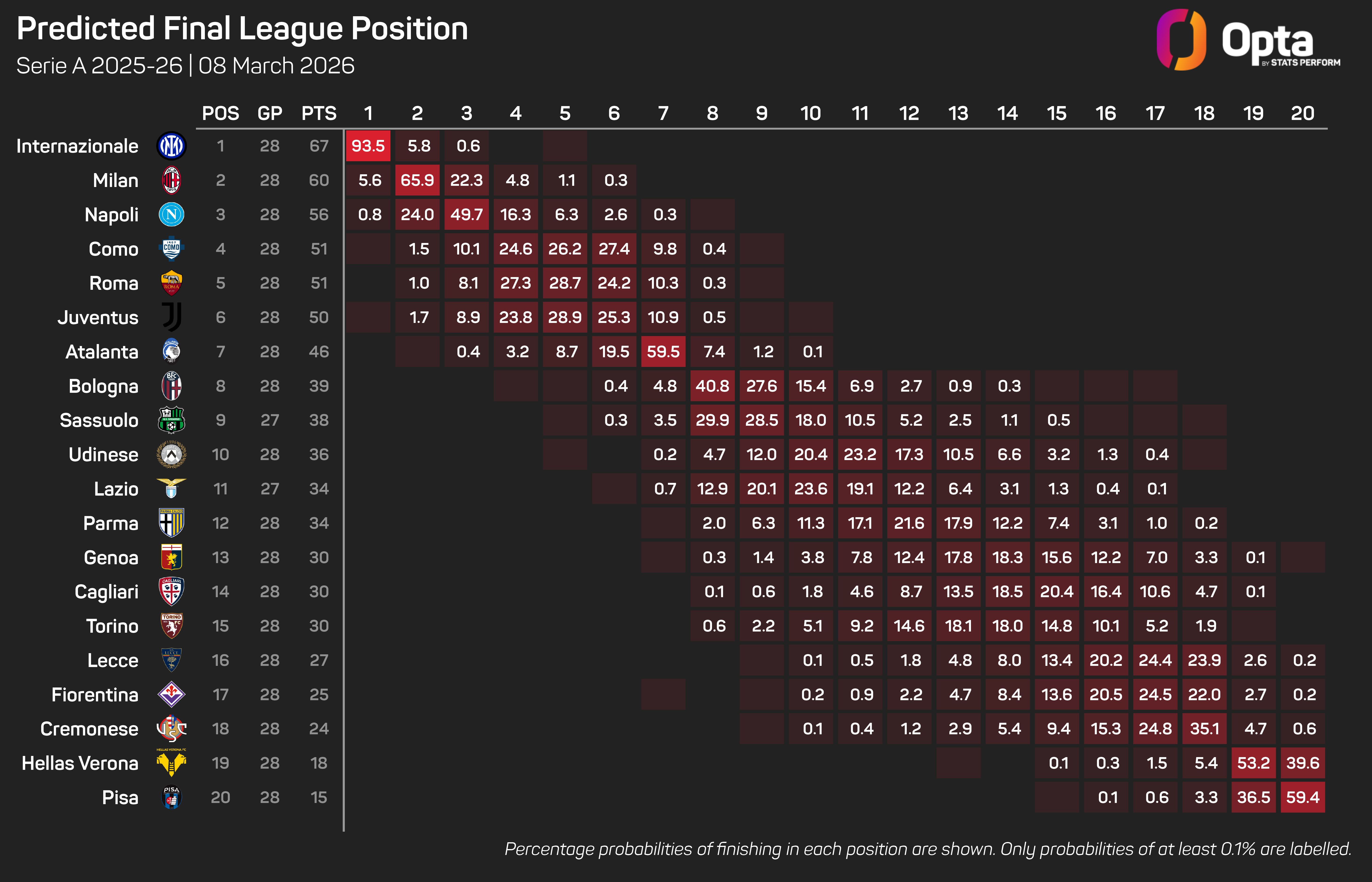 The Opta supercomputer has assigned Milan just a 5.6% chance of overhauling Inter from the summit, and Allegri seemed to agree with that assumption even after his team's latest victory.