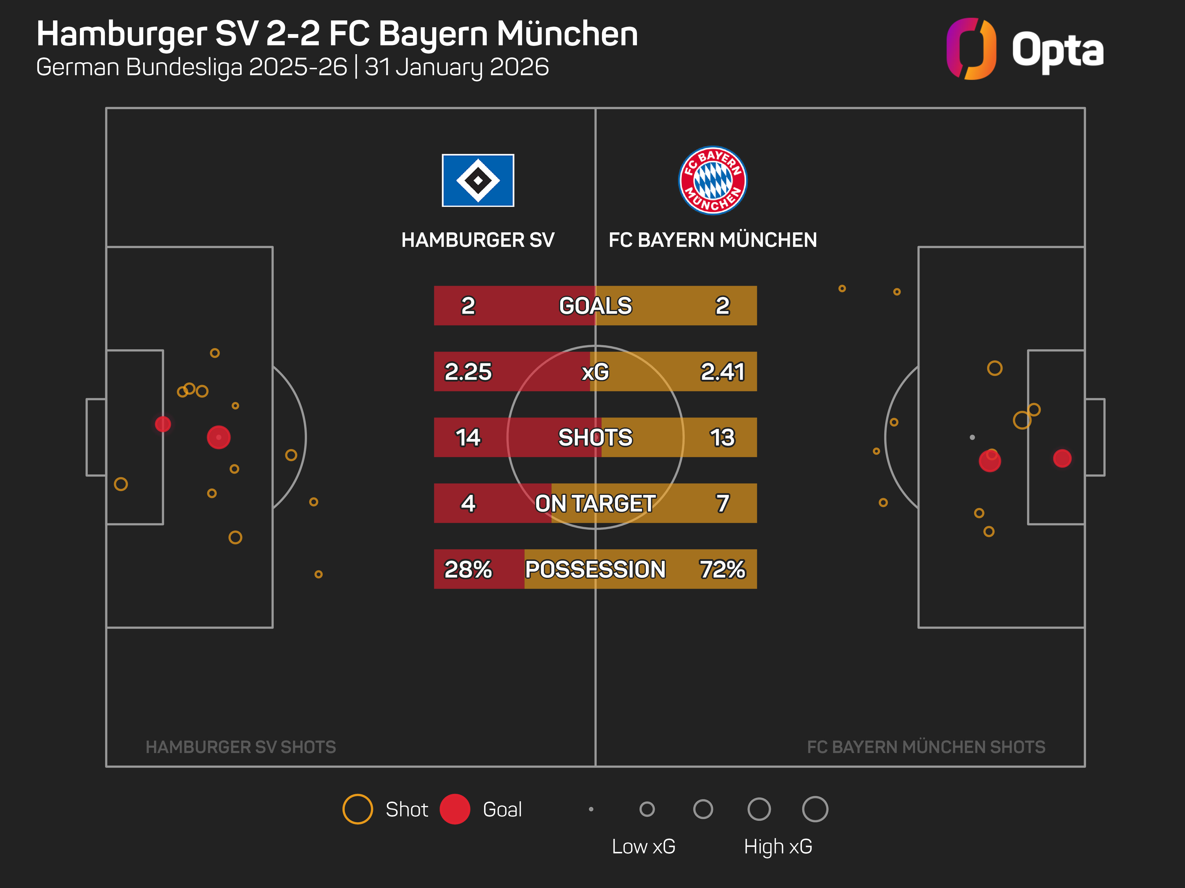 Bayern edged the expected goals (xG) battle, producing 2.4 to the hosts' 2.3 at Volksparkstadion, but had one fewer shot (13 to Hamburg’s 14), though they did hit the woodwork twice.