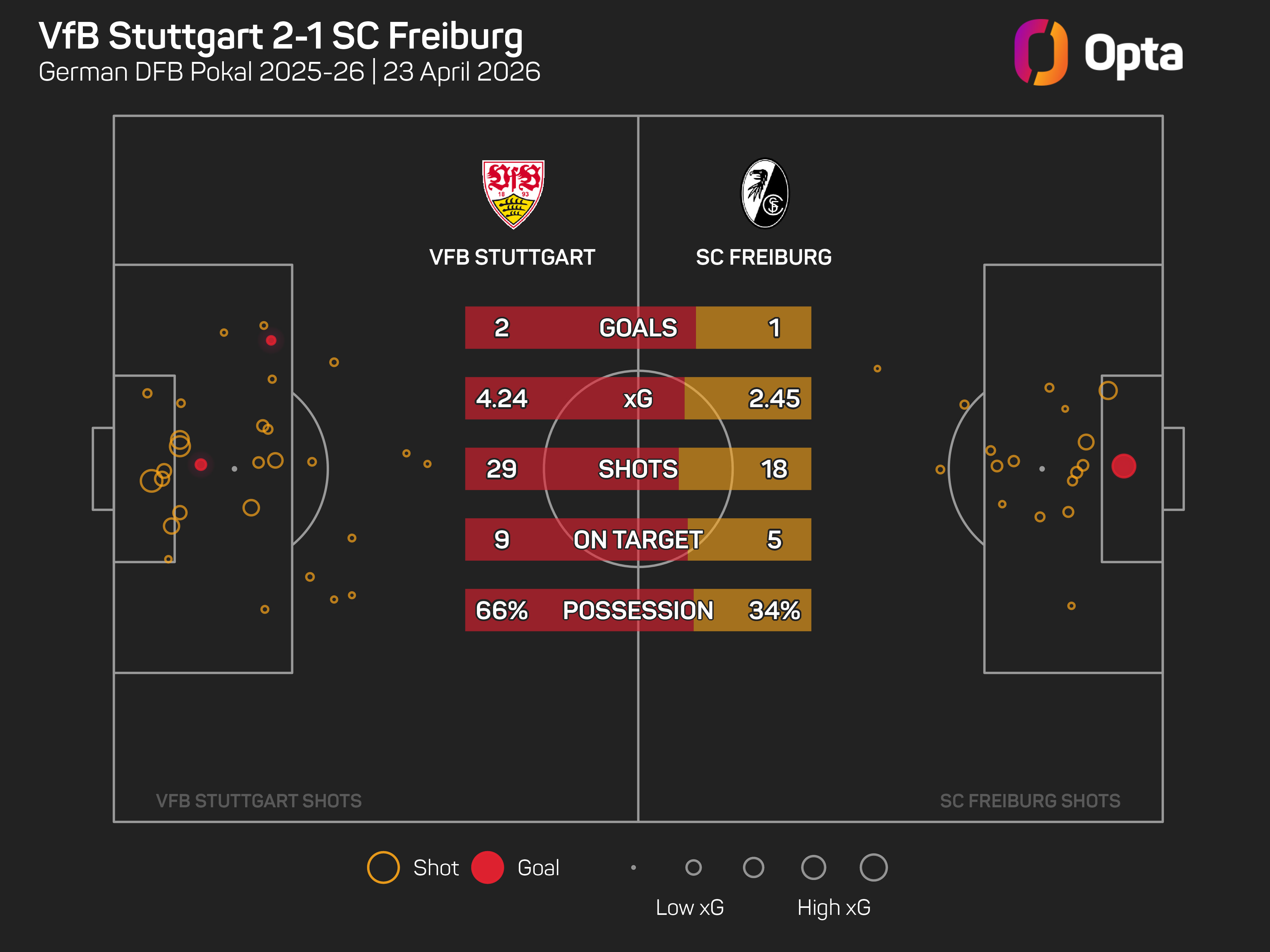Stuttgart created 4.2 expected goals (xG) from 29 attempts, with Freiburg racking up 2.5 xG from their 18 shots.