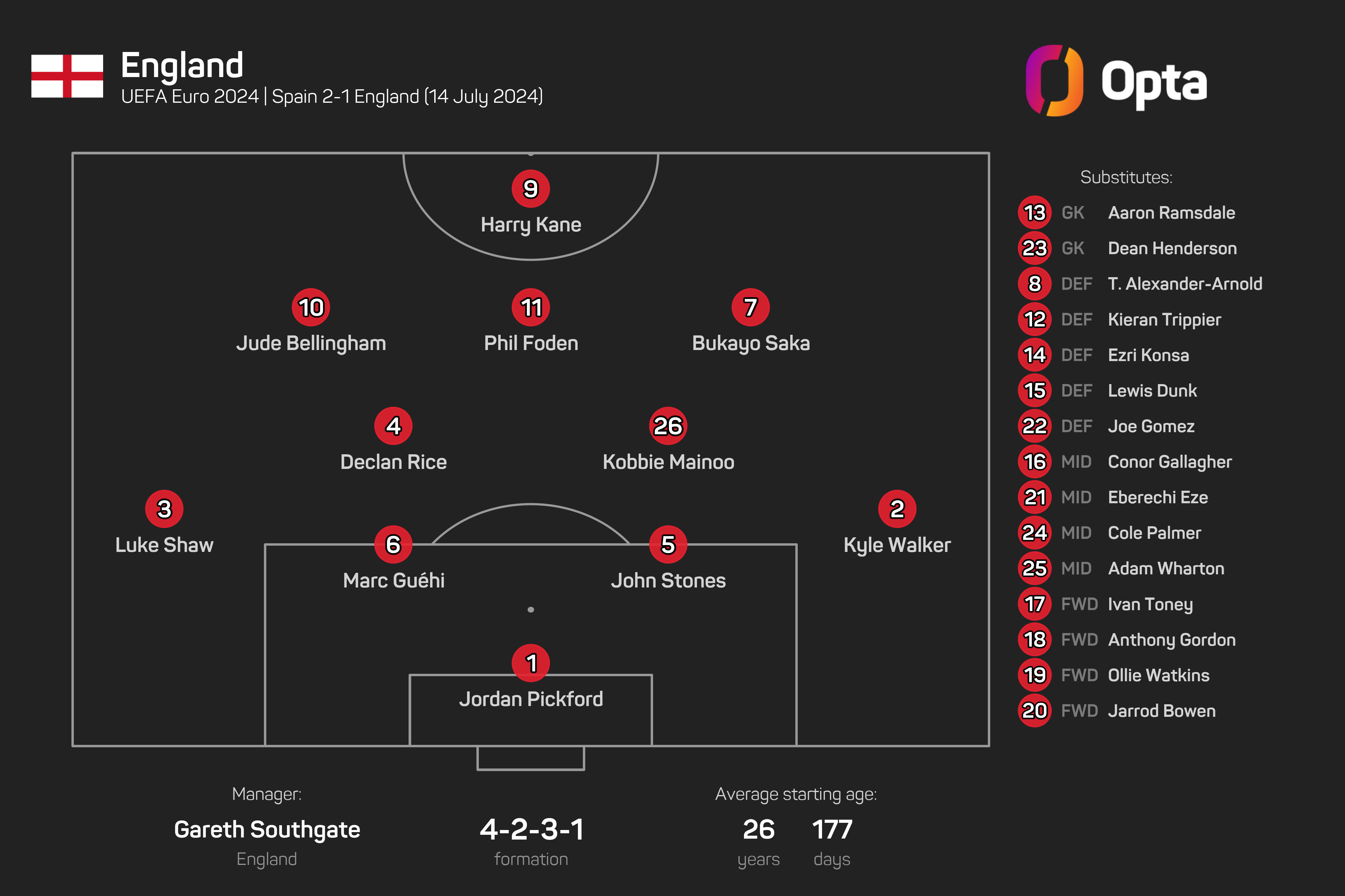 Kane, Bellingham and Foden all started all seven of England's games at Euro 2024, when they reached the final and lost 2-1 to Spain.