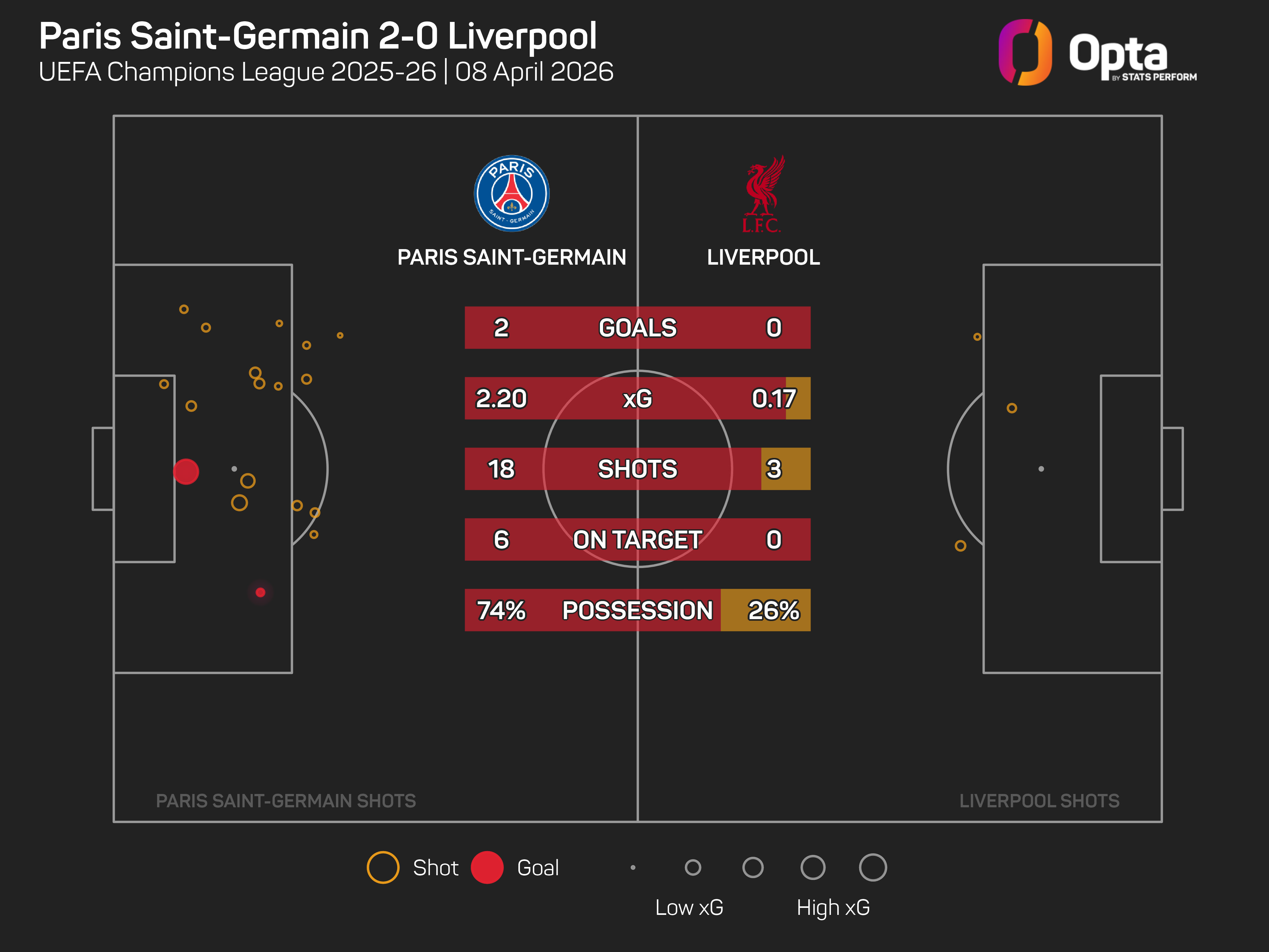 Luis Enrique's team were deserving of their win, having registered an expected goals (xG) total of 2.2 from their 18 shots, compared to Liverpool's 0.18 from three attempts.