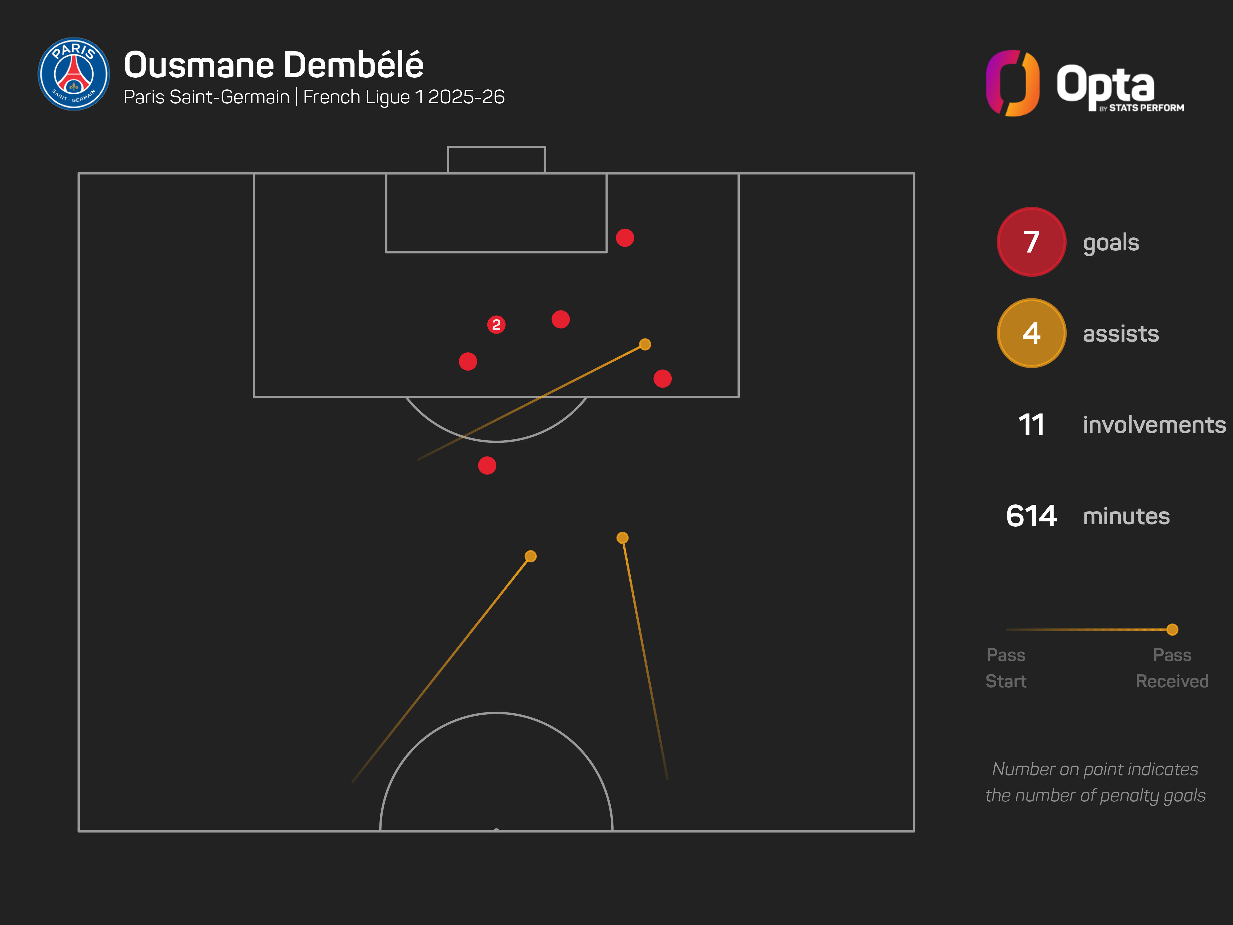 That is because PSG have scored the most goals from outside the box in Ligue 1 this season (10), while no team has scored fewer than Rennes (one).