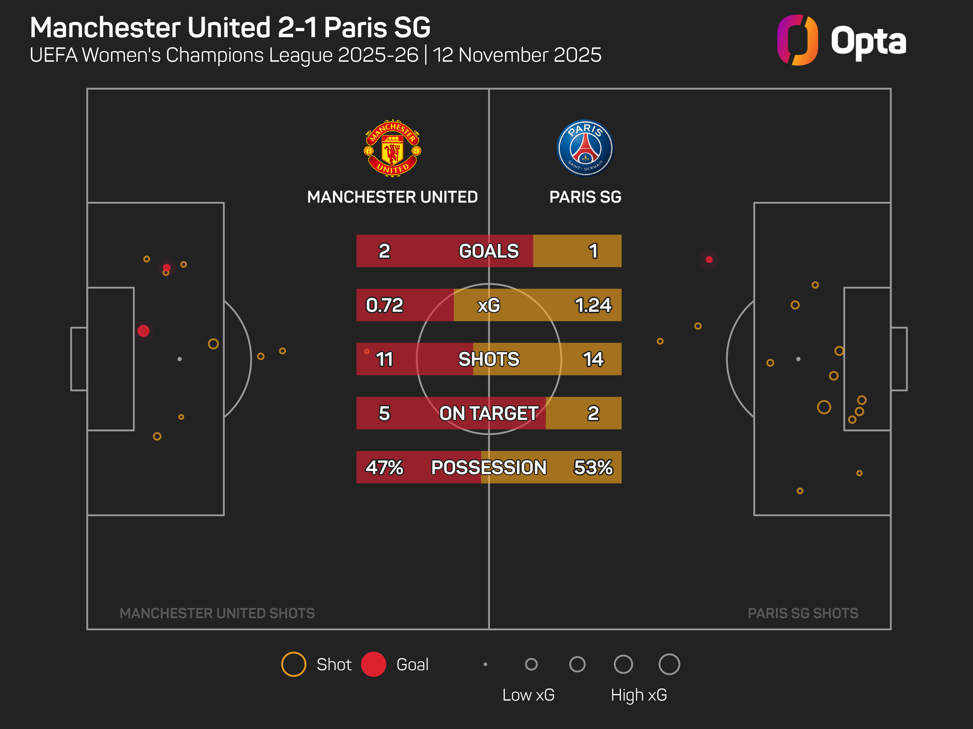 But United got five of their attempts on target, compared to just two for the Parisiens, who saw former Red Devils goalkeeper Earps make three saves on her return to Old Trafford.