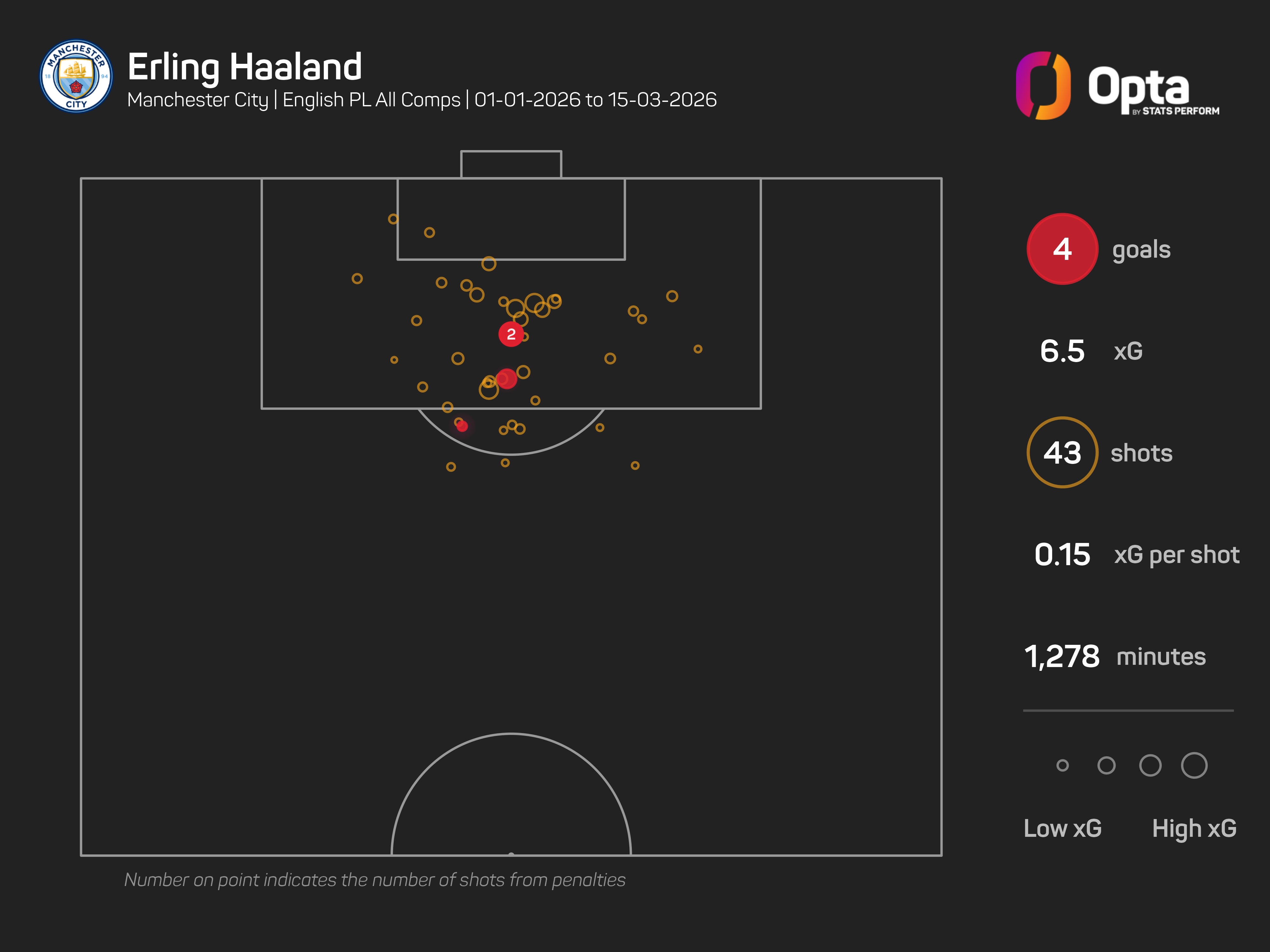 He had netted 25 times before the turn of the year, with only Kylian Mbappe (29) and Harry Kane (30) managing more, but in 2026, Haaland has scored just four goals.