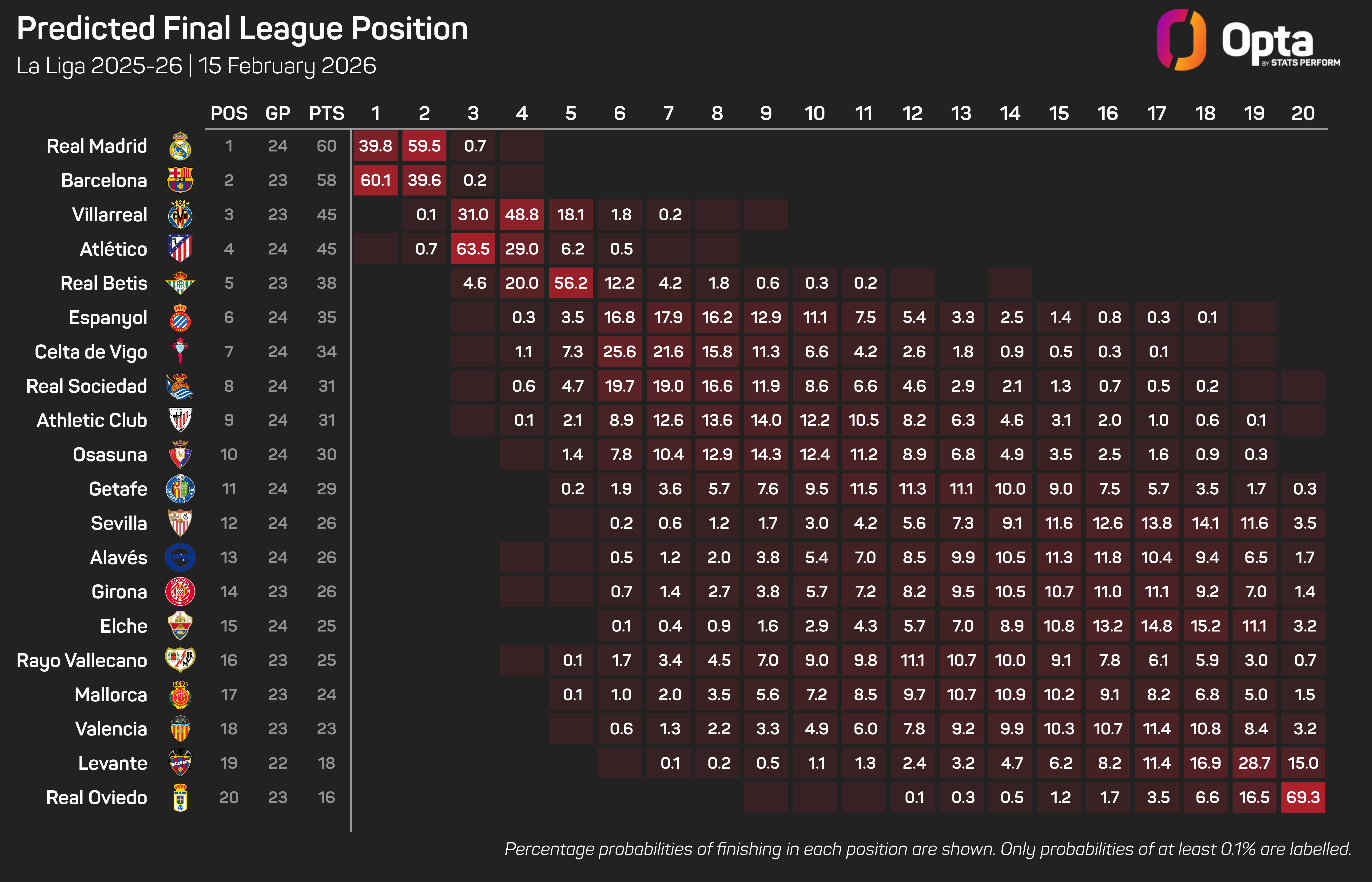 After Sunday's loss, the Opta supercomputer has assigned Atleti a 0% chance of winning their first top-flight crown since 2020-21, as they are now 15 points behind leaders Real Madrid in the table. They could be 16 points off the summit by Monday, when Barca attempt to reclaim top spot against Girona.