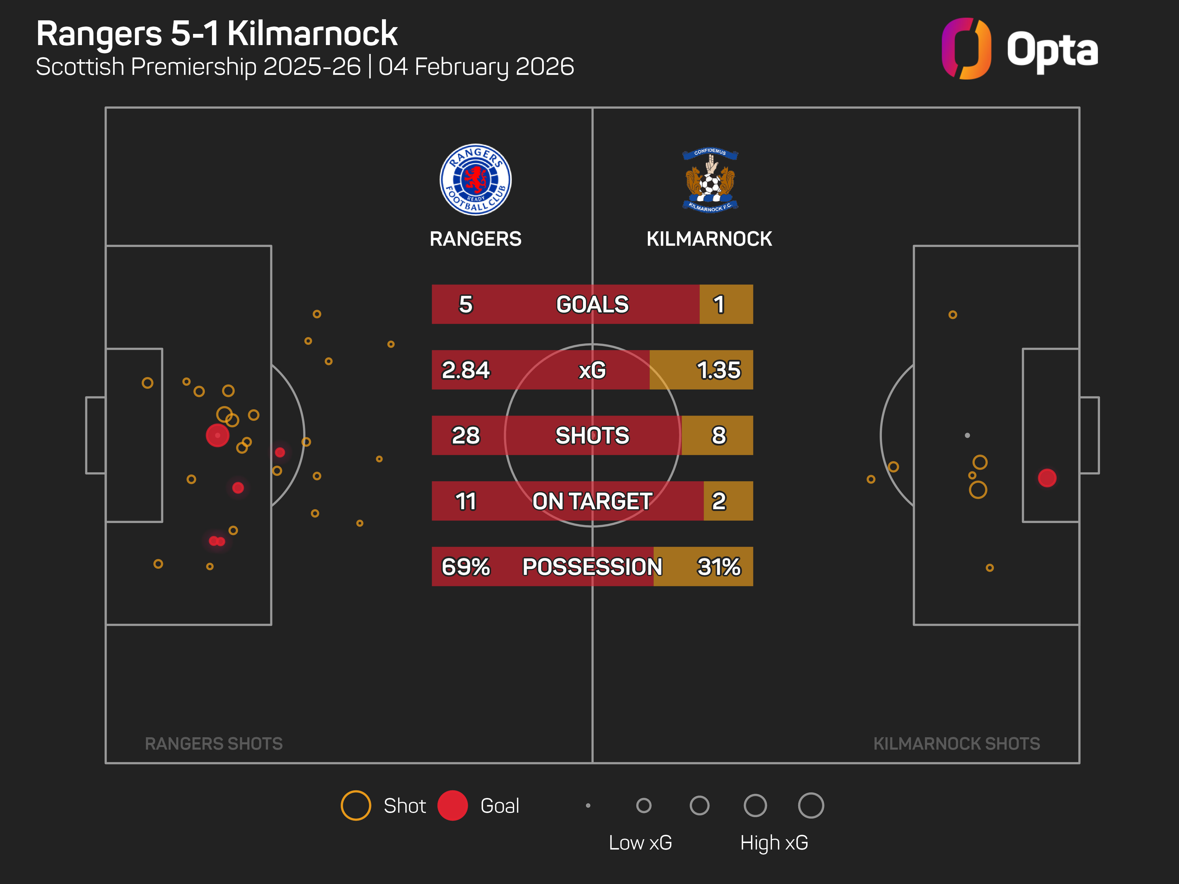 After Greg Kiltie tapped home to reduce Kilmarnock's deficit, another Rangers substitute – Oliver Antman – made it 4-1, with Mikey Moore adding some gloss in stoppage time.