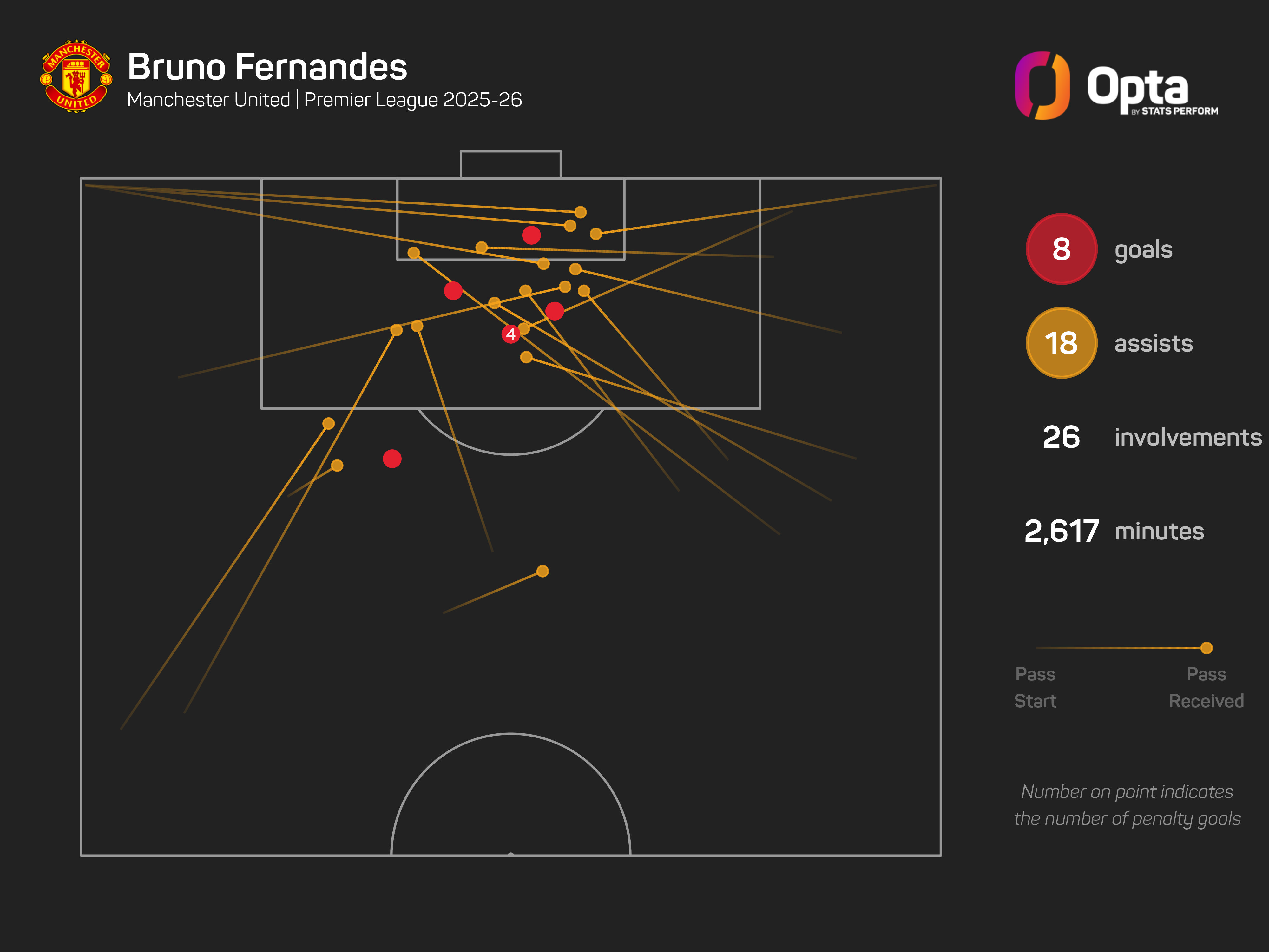 His 26 goal involvements (eight goals, 18 assists) is a total only bettered by Manchester City's Erling Haaland (31), though no player has created more chances in the Premier League this season than the United captain's 109.