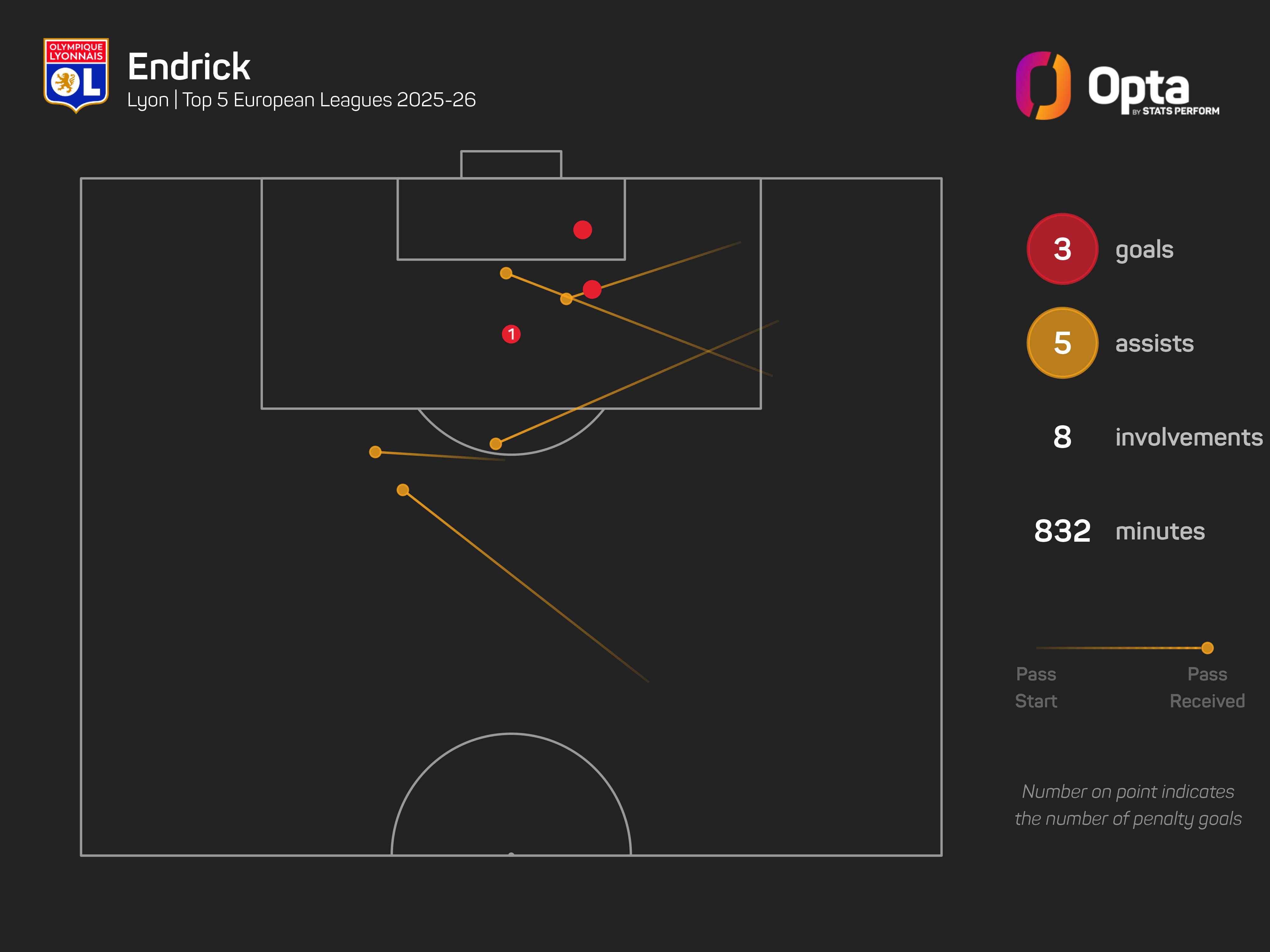 Only Lamine Yamal (12) and Yan Diomande (nine) have been involved in more goals than Endrick's eight (three goals, five assists) among players under 20 in Europe's top five leagues in 2026.