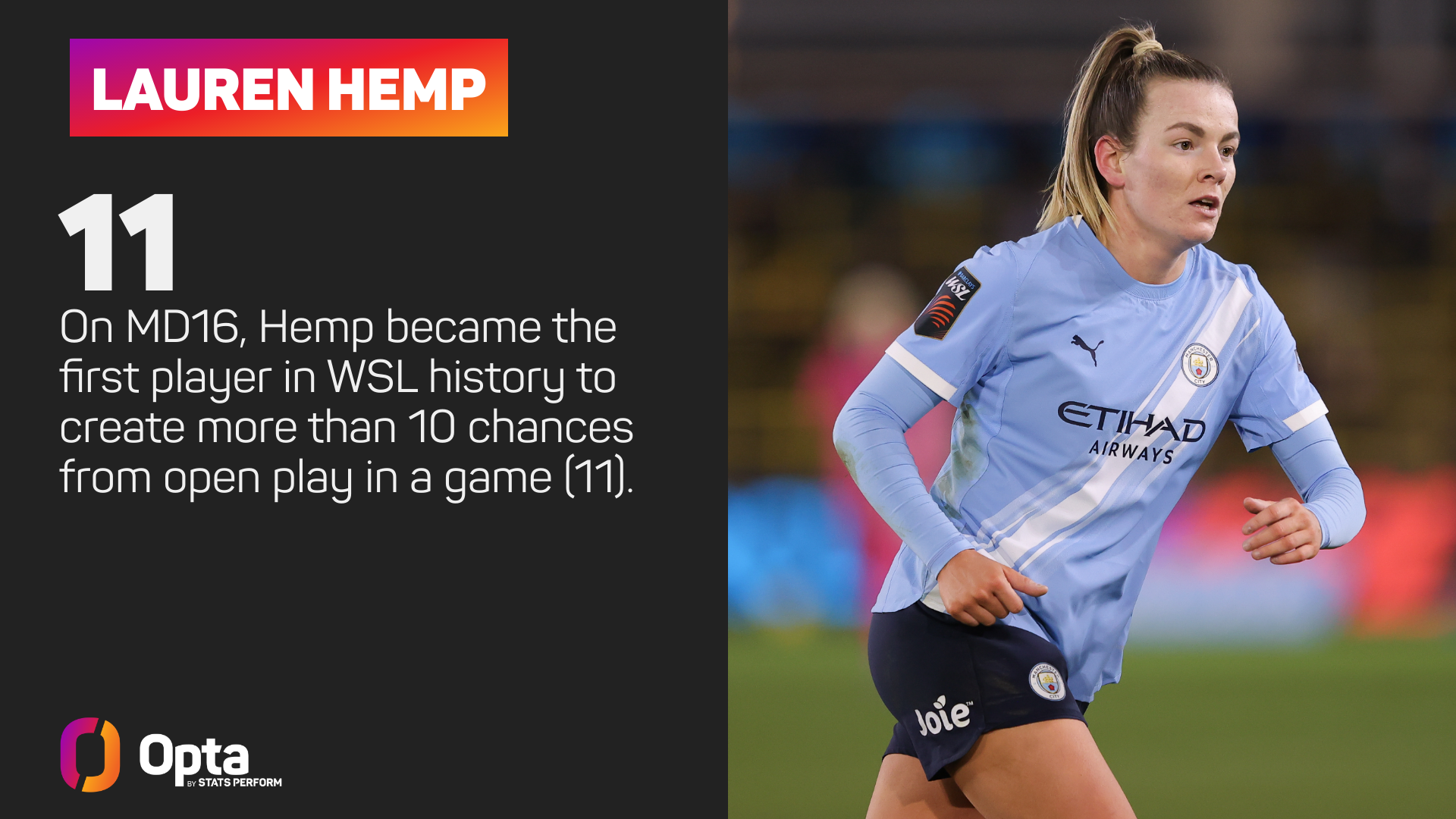 On MD16, Hemp became the first player in WSL history to create more than 10 chances from open play in a game (11), three of which were for Khadija Shaw.